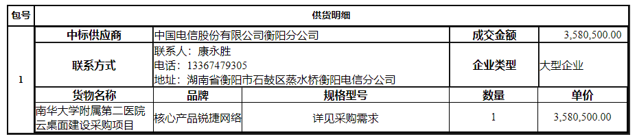 南华大学附属第二医院的南华大学附属第二医院云桌面建设项目公开招标采购项目于2024年05月21日结束,现将中标(成交)结果公告如下: