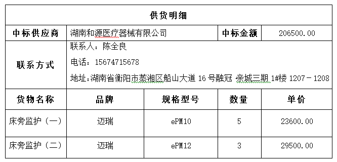湖南振湘医药电子商务有限公司受南华大学附属第二医院的委托,对南华大学附属第二医院床旁监护仪采购项目进行公开招标,开标会议于2023年04月25日09:00(北京时间)在湖南振湘医药电子商务有限公司衡阳分公司举行,随后进行了评标,全过程由有关监督部门监督,评标委员会按招标文件的规定进行了评审,现将中标结果公示如下: