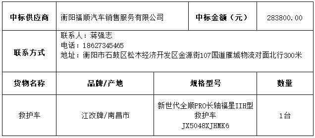 南华大学附属第二医院救护车采购项目于2024年1月9日结束,现将中标结果公告如下: