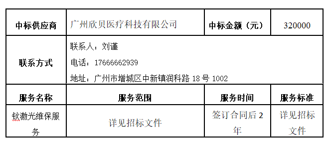 南华大学附属第二医院钬激光维保服务项目于2025年6月9日进行了开评标,现将中标结果公告如下: