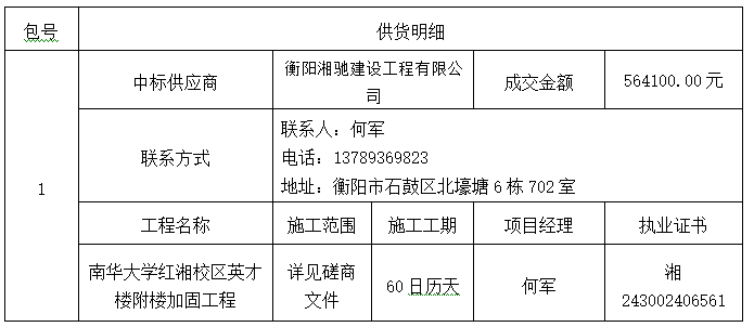 南华大学附属第二医院的南华大学红湘校区英才楼附楼加固工程竞争性磋商采购项目于2024年09月20日结束,现将中标(成交)结果公告如下: