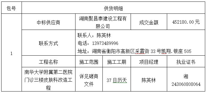 南华大学附属第二医院的南华大学附属第二医院门诊三楼皮肤科改造工程竞争性磋商采购项目于2024年09月29日结束,现将中标(成交)结果公告如下: