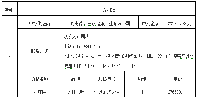 南华大学附属第二医院的内窥镜采购项目单一来源采购项目于2024年8月13日结束,现将中标(成交)结果公告如下: