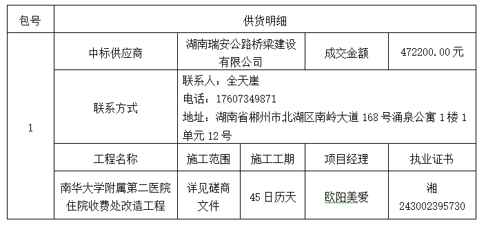 南华大学附属第二医院住院收费处改造工程 中标(成交)公告