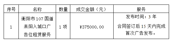 南华大学附属第二医院的衡阳市107国道耒阳入城口广告位租赁服务采购项目于2024年8月23日结束,现将成交结果公告如下: