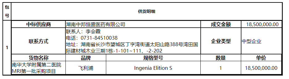 南华大学附属第二医院的南华大学附属第二医院 MRI第一批采购项目重新立项公开招标采购项目于2025年04月22日结束,现将中标(成交)结果公告如下: