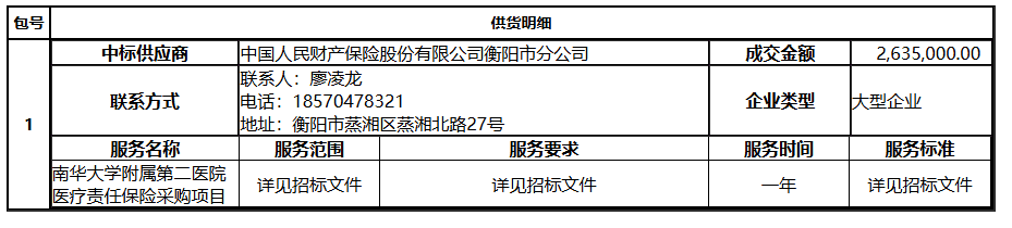 南华大学附属第二医院的南华大学附属第二医院医疗责任保险采购项目公开招标采购项目于2025年07月08日结束,现将中标(成交)结果公告如下: