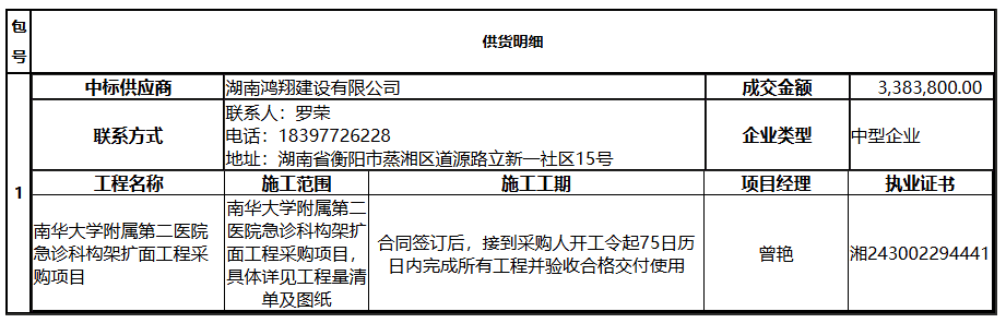 南华大学附属第二医院急诊科构架扩面工程采购项目中标(成交)公告