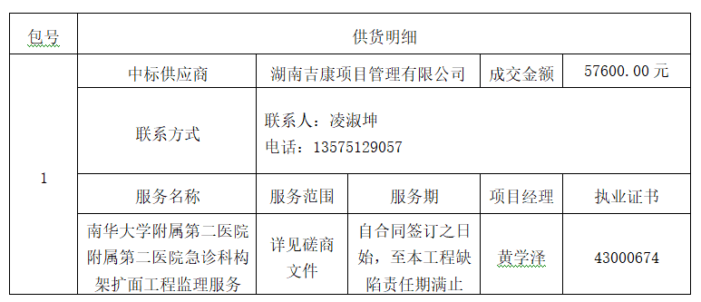 南华大学附属第二医院附属第二医院急诊科构架扩面工程监理服务中标(成交)公告