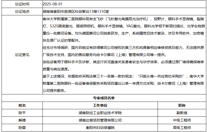 南华大学附二医院眼科的蔡司设备系蔡司独家研发,系统精密且涉专用软件、加密配件;国内无授权第三方可维修,售后仅卡尔蔡司(上海)管理有限公司提供;因其关乎患者安全与诊疗效率,需原厂维保,故依据相关法规建议单一来源采购,拟定该公司为服务商。。