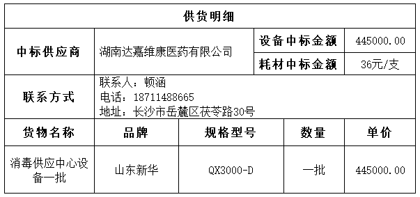 南华大学附属第二医院的南华大学附属第二医院消毒供应中心设备一批采购项目于2025年08月12日结束,现将中标结果公告如下: