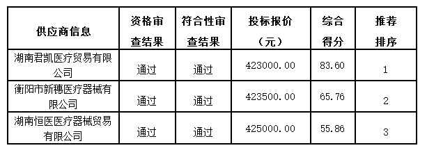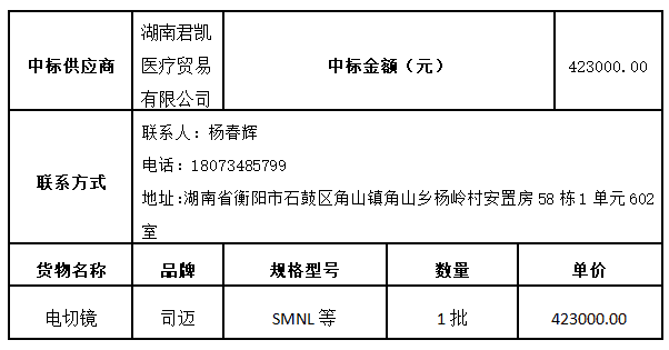 南华大学附属第二医院电切镜采购项目于2025年8月15日进行了开评标,现将中标结果公告如下: