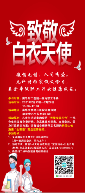疫情反复无情,人间有爱长存,为感谢疫情期间医护人员的付出和贡献,春节节后大福利,南华附二医院生长发育专科推出“天使钜惠活动”。