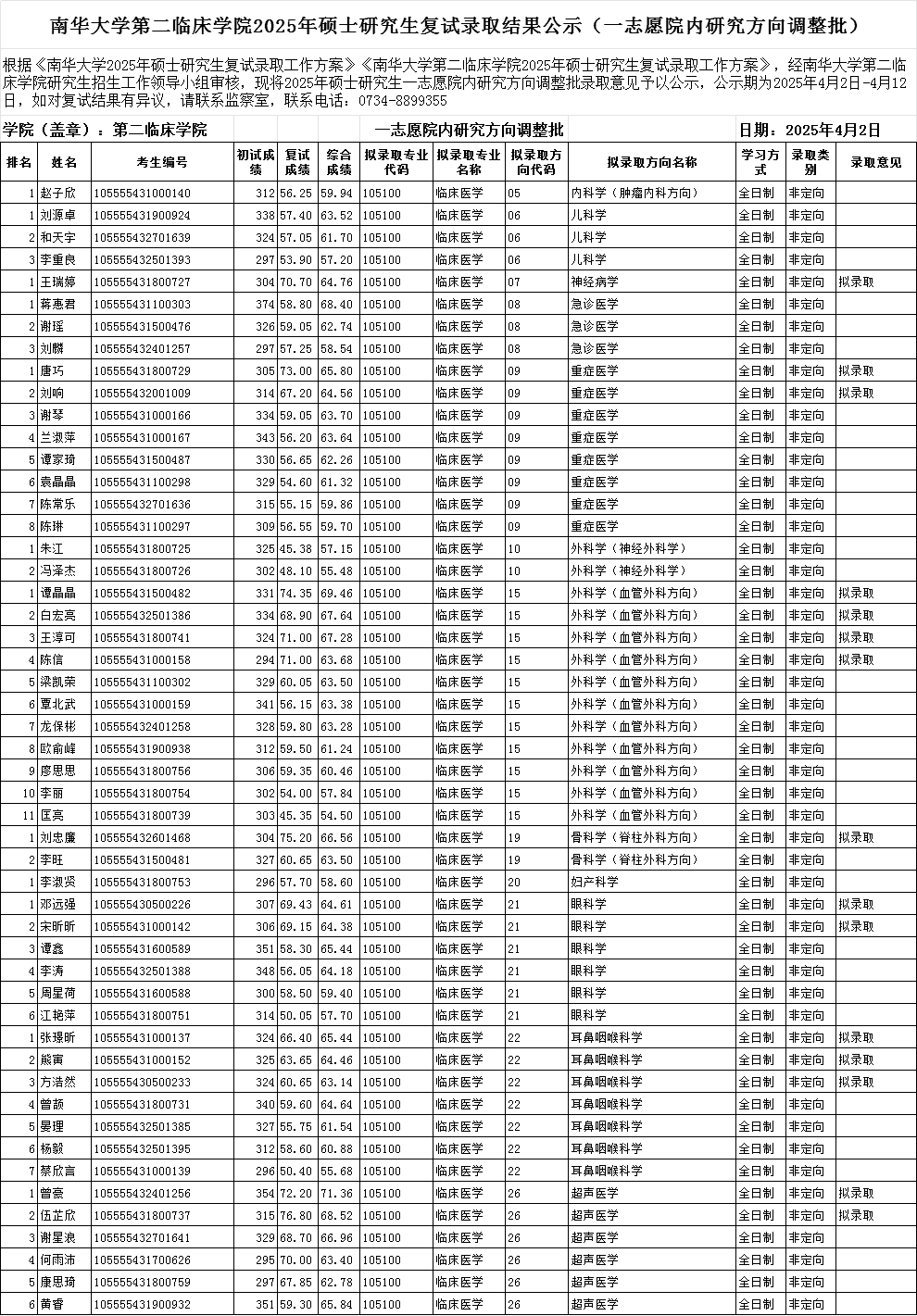 南华大学第二临床学院2025年硕士研究生复试录取结果公示(一志愿院内研究方向调整批)