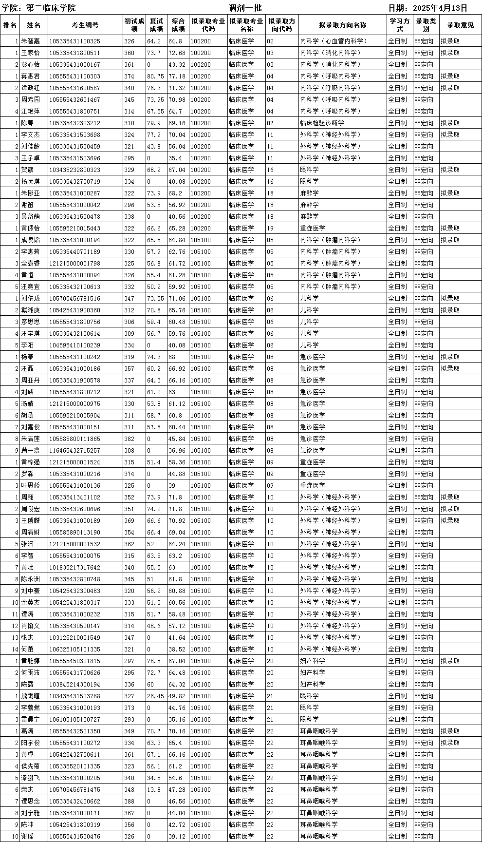根据《南华大学2025年硕士研究生复试录取工作方案》《南华大学第二临床学院2025年硕士研究生复试录取工作方案》,经南华大学第二临床学院研究生招生工作领导小组审核,现将2025年硕士研究生第一批调剂复试录取意见予以公示,公示期为2025年4月13日-4月23日,如对复试结果有异议,请联系监察室,联系电话:0734-8899355。