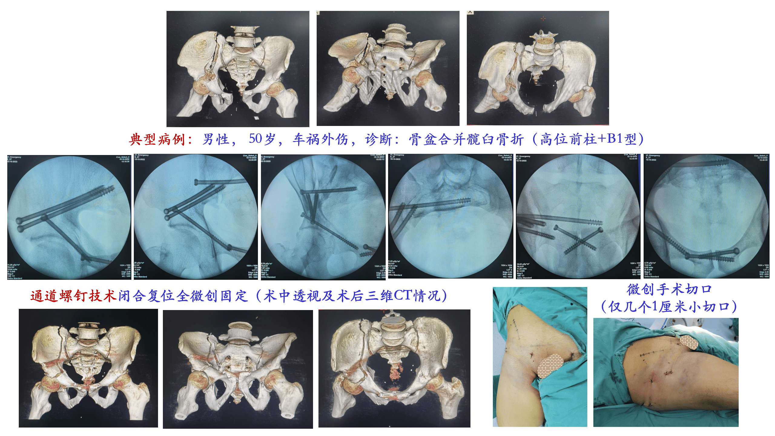 通道螺钉技术是骨盆骨折微创治疗的关键核心技术。通过生理的骨性通道经皮微创置入长螺钉,实现骨折的稳定固定。具有切口小,出血少,手术时机早,手术时间短,创伤小,术后感染率低,患者恢复快速等显著优点。我院同省内为数不多的医院同时率先开展,在市内为首家应用。