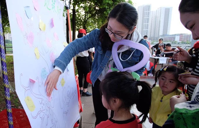 活动开展时,志愿者们早早抵达现场装饰,很快便迎来一批批行人。18名志愿者各司其职,或为行人介绍活动相关内容,或引领行人签名。测量血压处,有专门的志愿者在一旁为之讲解噪音污染对高血压的影响。知识竞答处,每人随机抽取一套题,共三题,答对者可以领取奖品,对答错者志愿者们会就答错的题目普及相关知识。“点绿”地球树处,行人们纷纷将自己对保护地球的建议写在便利贴上贴在地球树上。整个场面和谐温暖,志愿者们与行人积极互动,耐心地为行人们解疑答惑,将医学生的仁爱之心体现的淋漓尽致。