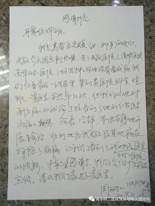 八点半左右,一个轮椅被推进治疗室,轮椅上坐着一位老奶奶,表情痛苦,被告知吃鱼后吞咽疼痛,推送老奶奶的是她的两个女儿,家人言语中透露出焦急紧张,由于患者年龄大,基础疾病多,鱼刺嵌顿位置较深等原因,两个女儿推着轮椅已经辗转市区多家医院,均被各种理由拒绝收治,家属怀着最后的希望来到南华附二医院,如果再看不成,真的害怕母亲的鱼刺卡喉继续加重,身体无法承受。凌医师看到老人家紧张害怕,又行动不便,一边安慰老人一边将其搀扶到诊疗椅,并不断与老人家属说话,减轻老奶奶的紧张情绪,充分局麻后手法娴熟地将一长约2cm的鱼刺取出,让所有在场的患者及家属称赞不已,他详细向家属交代注意事项,急忙又赶去血管外科处理一个鼻出血的急诊病人,老奶奶及她的家人被这位年轻敬业的小伙感动,在护士站借了纸笔,默默写下感谢信并一再托付值班护士将其转交给科主任。