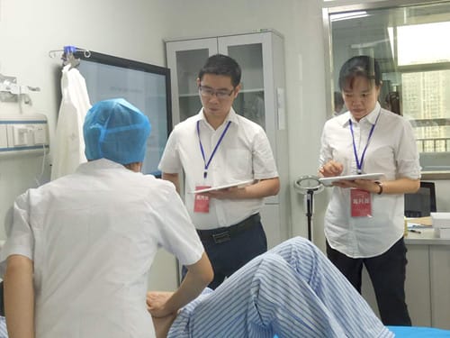 比赛采用OSCE系统,使考核过程信息化和智能化,是本次比赛的一大亮点,其中包括智能化信息排考、手持电脑评分、成绩自动统计、中控多角度全方位监控、智能监控转播等,使高校、便捷、客观、公平在本次比赛中体现得淋漓尽致。