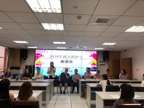 理论授课结束后,护理部特地组织了新入职护士座谈会,护理部主任、副主任、科护士长及部分护士长代表出席了本次会议。会上,护理部主任谭玲玲鼓励大家畅所欲言,表示护理部将尽量帮助解决大家所提出的困惑。新入职人员主要就分科、轮科培训、学历提升及待遇等问题提出了问题,与会人员都一一做了详细的解答。