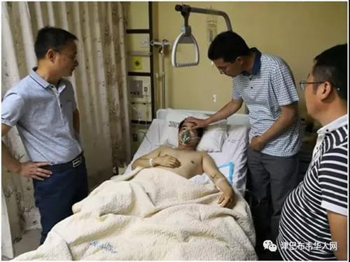 △陈劲松(右二)等援津医疗队员看望受伤中方员工