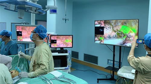 胸外科刘翔主任介绍:随着体检意识的增强和CT检查的普及,肺小结节和磨玻璃影检出率越来越高。对需要手术的病人来说,病灶越小手术越早越好。而对于医生来说,病灶越小,术中精准定位越难。尤其是位于肺深部的结节,常常让手术医生头痛。近红外荧光胸腔镜与普通胸腔镜不同的是:术中对定位肺小结节区域进行荧光显影,病灶“无处遁形”,从而达到精确切除肺结节的目的并最大程度地保留患者肺功能。此外,荧光造影剂没有放射性,病人及医务人员相对更加安全。同时,术中实时评估,手术操作、观察同步进行,进而缩短了手术时间。