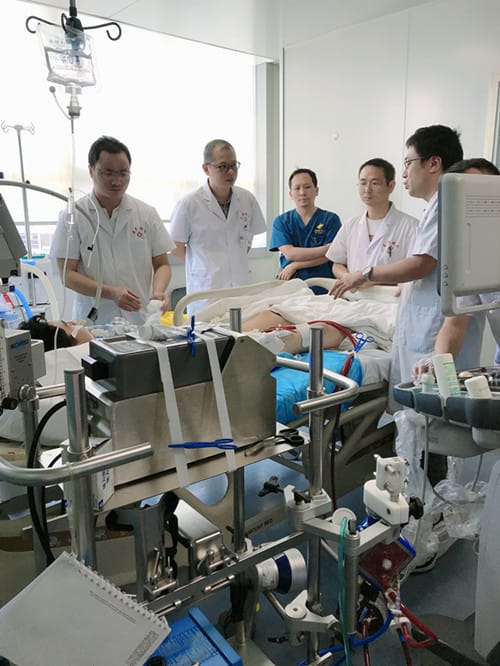 8:20。救护车将S同学送至我院急诊抢救室。至此,S同学仍持续室颤,未能恢复窦性心律,瞳孔散大、光反射消失。此时现场指导救治的急诊科副主任医师袁海军果断决策,电话联系重症医学科ECMO团队。接到电话后,重症医学科主任李方立即通知团队所有成员就位,人员、设备以最快速度往急诊抢救室集结。