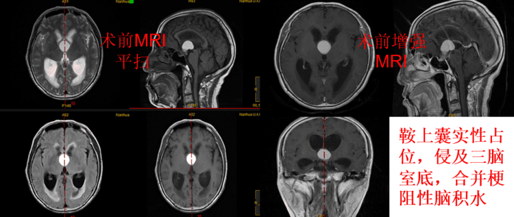 患者,陈某,67岁。因“反应迟钝、记忆力下降半年”入院。入院时MRI示鞍区占位并梗阻性脑积水,考虑为颅咽管瘤可能性大。