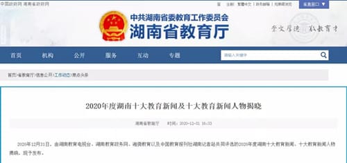 12月31日,由湖南教育电视台、湖南教育政务网、湘微教育以及中国教育报刊社湖南记者站共同评选的2020年度湖南十大教育新闻、十大教育新闻人物正式揭晓,我院周煜中入选湖南十大教育新闻人物。