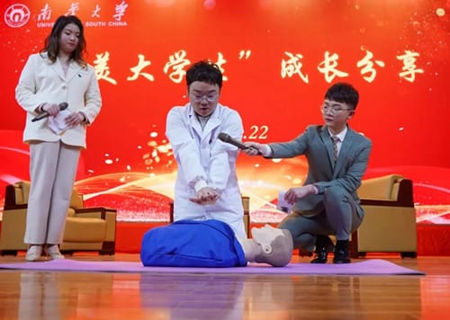 周煜中同学跪地救人的事迹得到了主流媒体的广泛关注,人民日报、央视新闻客户端、中国青年报、环球网、中国网、湖南日报等多家主流媒体进行了关注和报道,赞扬周煜中同学见义勇为的正能量行为,全网阅读量(传播量)达1000W。今年12月,周煜中被评为南华大学“最美大学生”,在“最美大学生”成长分享环节上,周煜中与大家分享了自己的成长故事,为大家现场演示急救技能,希望除了医务人员以外能够有更多的人掌握现场急救知识和技能,为医务人员争取更多宝贵的急救时间,让更多需要帮助的人受益。