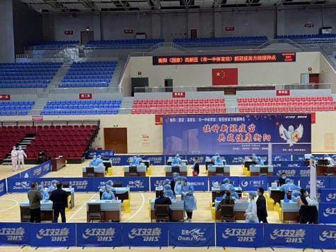 ▲南华大学附属第二医院疫苗接种医疗队在高新区(市一中体育馆)新冠肺炎疫苗方舱接种点开展工作