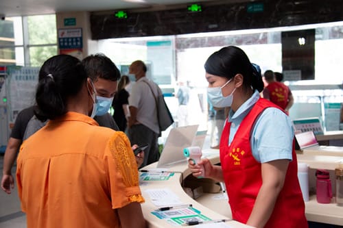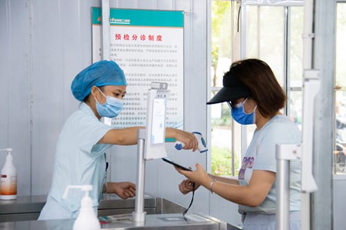 “您好,请出示行程码、健康码,佩戴好口罩!”“请您配合好测量体温,谢谢”…志愿者们忙碌在预检分诊一线,查体温、口罩、健康码,询问流行病学史,对检出发热患者由专人专线引导至发热门诊就诊,做到闭环管理。