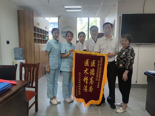 一位患者家属将一面绣有“医德高尚 医术精湛”的锦旗送到张群锋主任手里,见这位家属紧拉着张主任的手,他激动地说:“我是来感谢你们的,感谢张医生精湛医术,感谢你们无微不至的护理服务,感谢你们认真负责的精神,不知道该怎么表达对你们的感谢,所以特地为你们制作了一面锦旗……”