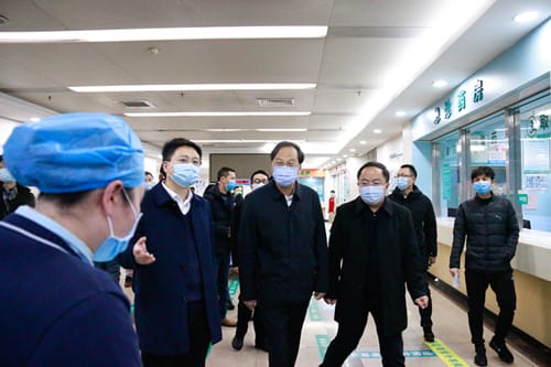 高山书记走访了医院门诊大厅、发热门诊、核酸采样室、急诊科、创伤中心、第二住院部等地。