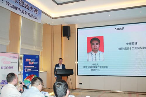 来自各家医院肝胆胰外科青年才俊们分别展示了腹腔镜半肝切除、腹腔镜尾状叶切除、荧光腹腔镜导航下肝段切除、腹腔镜胰十二指肠切除等肝胆胰外科的高难度手术,精彩的手术视频演示,犀利到位的评委点评,热烈的学术讨论使得会议精彩纷呈。经过一上午的激烈角逐,李明亮医生的手术视频“腹腔镜胰十二指肠切除术”得到赛会评委一致认可,评委们认为适应症把握得当,手术思路清晰,操作流程规范,解剖结构清晰,最终夺得全场比赛第二名,顺利晋级湖南赛区决赛。