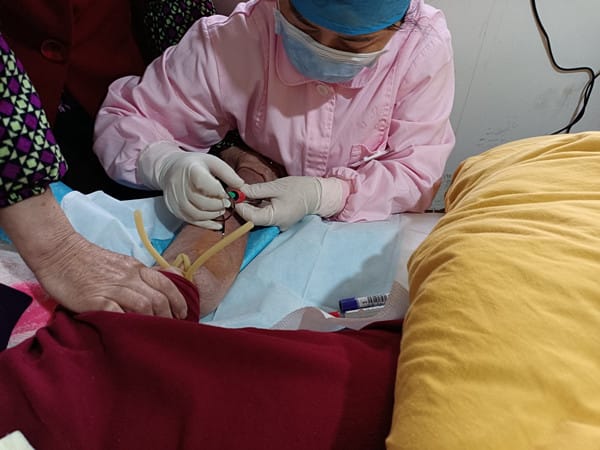 该患者因脑梗死瘫痪卧床多年,生活不能自理,身体消瘦且伴有糖尿病控制不佳。平日由保姆照顾生活起居,去医院看病十分不易。近日来患者因咳嗽咳痰,于是希望通过互联网+线上下单,由医务人员提供居家上门采血服务。