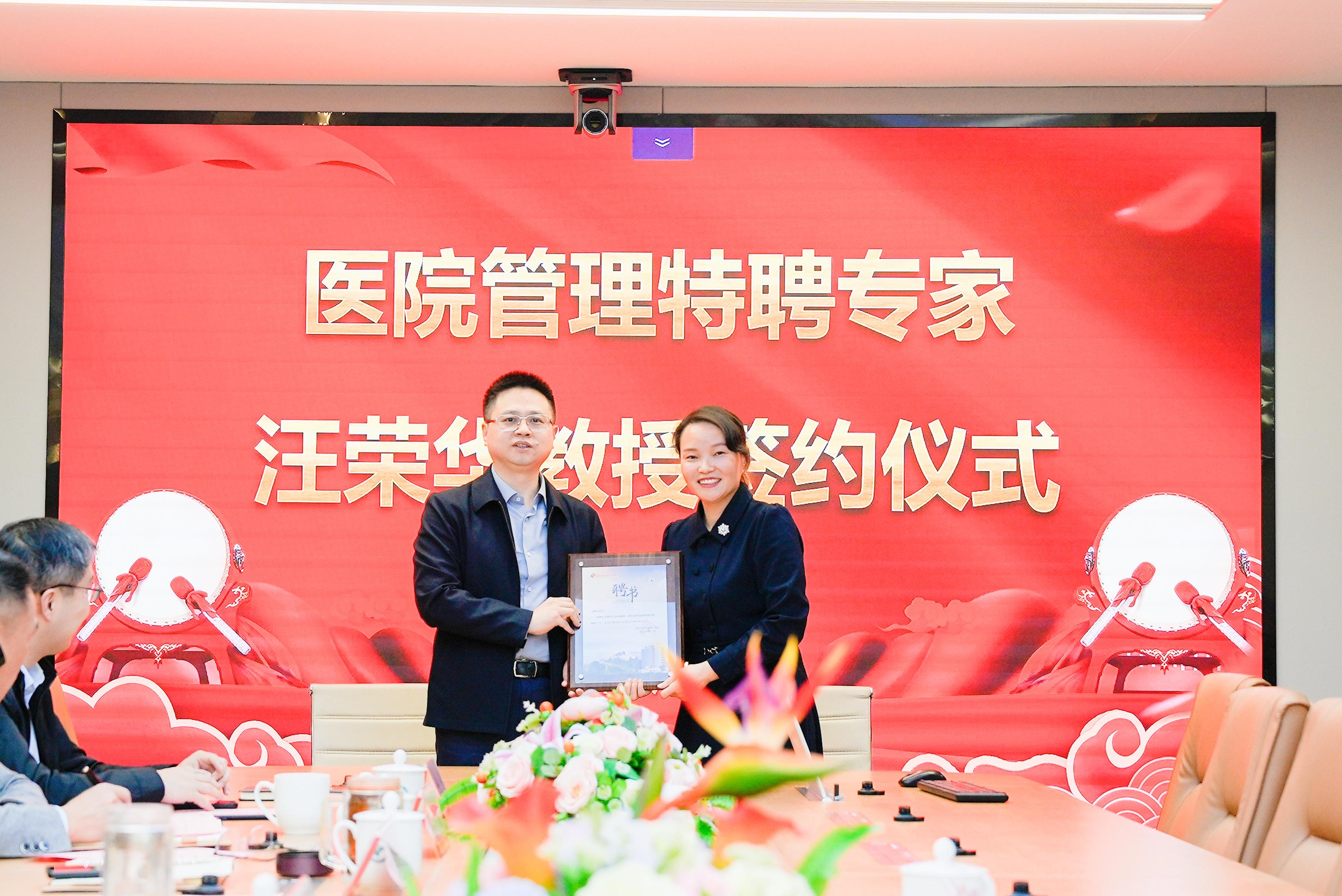 ▼南华附二医院院长刘文捷(左)为医院管理特聘专家汪荣华(右)颁发聘任证书
