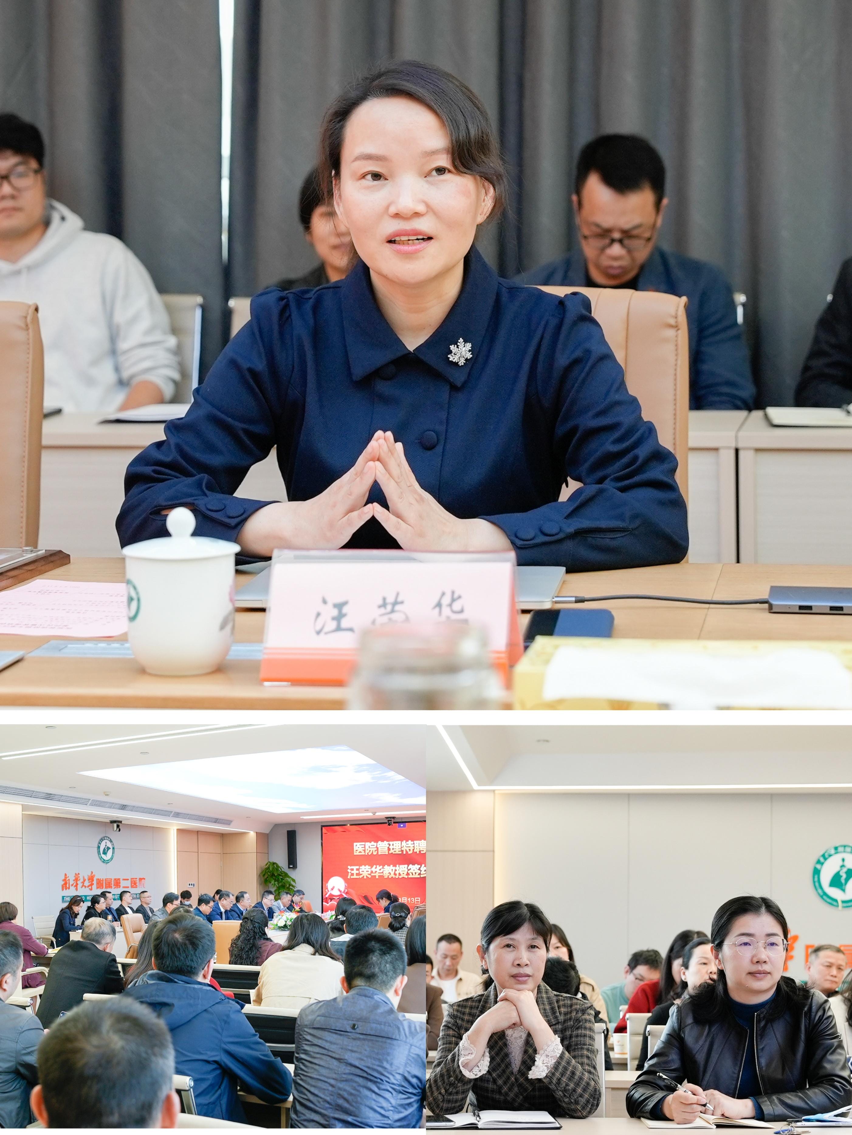 签约仪式上,南华附二医院院长刘文捷代表医院与汪荣华教授进行签约,并为汪教授颁发聘任证书。刘院长就汪荣华教授的学术和管理经验、医院现阶段发展面临的机遇和挑战进行了简要介绍。刘院长用五深强调,要求大家深情工作,深挖数据,深入了解,深思困难,深造学习,齐心协力推进医院改革进入加速度。