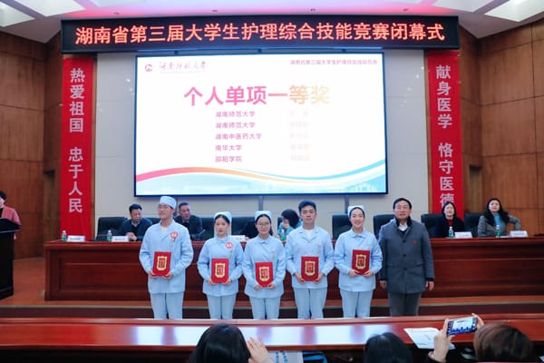 本次大赛共有湖南师范大学、南华大学、湖南中医药大学等11所院校44名选手参赛,比赛采用站点式、赛道式与单站式结合的竞赛方式,内容覆盖内、外、急危重症、老年护理、社区护理等学科。大赛旨在强化护理基本知识和技能,培养学生评判性思维和应急处置能力,锻炼临床思维及实践能力,提升人文关怀精神和团队合作意识,培养高水平护理人才。