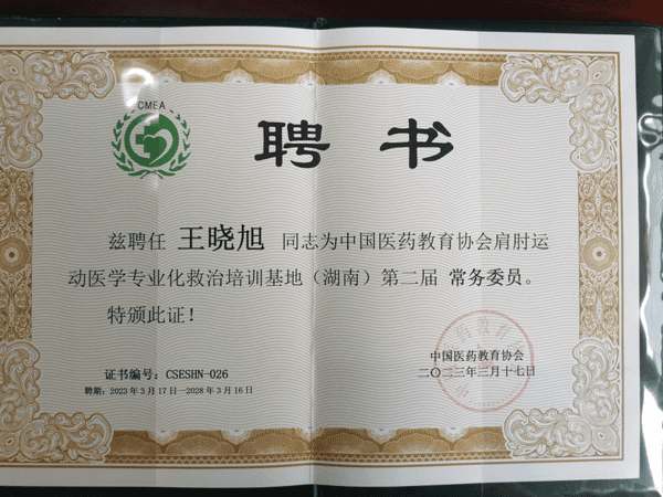 3月17日在邵阳举行的中国医药教育协会肩肘运动医学专业化培训基地(湖南)换届选举大会中,我院王晓旭教授再次担任中国医药教育协会肩肘运动医学专业委员会常务委员,黄沛冠、曾智担任委员。