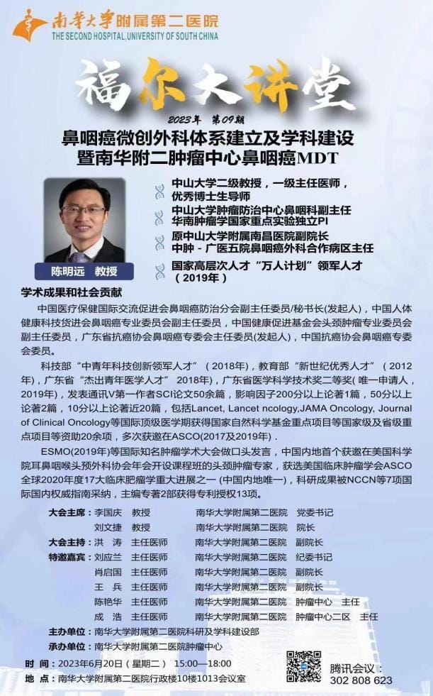 为更好地促进医院科研与学科建设,推进医院医教研协同发展,南华大学附属第二医院特邀中山大学肿瘤防治中心陈明远教授于2023年6月20日莅临该院“福尔大讲堂”进行“鼻咽癌微创外科体系建立及学科建设”专题讲座,并指导鼻咽癌MDT活动开展和团队建设。本次讲座由科研及学科建设部主办,肿瘤中心承办。