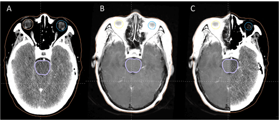 肿瘤中心二区主任成浩博士介绍:在放疗靶区勾画阶段是基于增强CT图像,但CT图像在软组织坏死,水肿等区域成像质量不如核磁共振(MRI)。因此在头颈部和盆腔等特定位置的肿瘤靶区勾画必须结合磁共振定位扫描。
