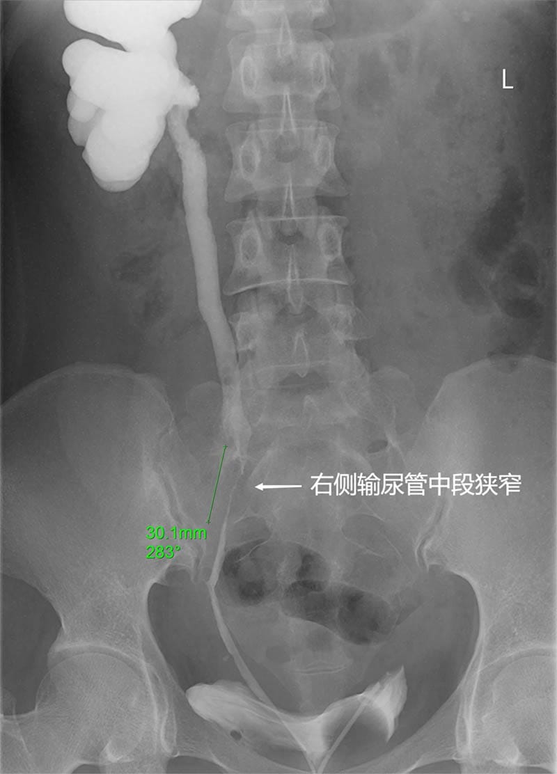 李志军博士带领手术团队采用双镜联合技术,先在腹腔镜下游离右输尿管,再利用输尿管镜精准定位输尿管的狭窄段,充分游离后确认狭窄段长约3厘米,输尿管周围严重粘连,右侧髂内动脉完全粘连于狭窄段后下壁,输尿管中上段管壁明显炎性增厚、张力高、弹性差,如强行狭窄段切除+断端吻合极其困难,且需离断右侧髂内动脉,术后容易出现输尿管吻合口缺血、漏尿、再发狭窄等并发症。在与患者家属深入沟通后,遂决定采用自身阑尾代输尿管。在腹腔镜下进行阑尾切除,剖开阑尾及输尿管狭窄部,分别将阑尾瓣的近远端和输尿管近远端进行吻合,“移花接木”般完美的恢复了右输尿管的连续性和通畅性,术中输尿管镜探查输尿管阑尾吻合腔通畅,手术顺利完成,术后恢复良好,右肾积水明显减轻。