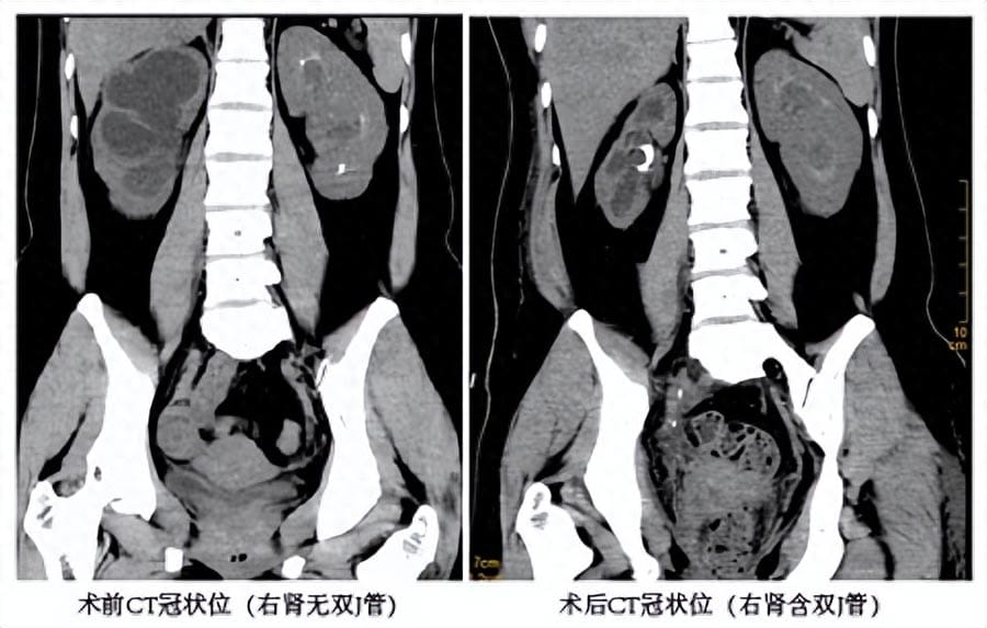 患者朱某,女性,40岁,因“双侧DJ管置入术后1月余”入住南华大学附属第二医院东院泌尿外科,患者既往有多次右输尿管结石手术史,今年7月再次因“左输尿管上段结石并左肾积水;双肾多发结石;右输尿管中段狭窄并右肾中度积水”在我院全麻下行“输尿管软镜下左肾结石、左输尿管结石钬激光碎石术+右输尿管中段狭窄扩张术+右输尿管支架管置入”手术治疗,术后恢复良好。此次为进一步处理“右输尿管中段狭窄”入院,因长期携带输尿管支架管,不仅影响剧烈活动,还可能引发反复尿路感染、疼痛、血尿等支架管刺激征,严重影响她的正常生活与工作,患者对此非常困扰。泌尿外科副主任兼东院泌尿外科主任李志军博士带领团队经过慎重探讨,在成功开展腹腔镜膀胱瓣代输尿管成形修复长段输尿管狭窄(6cm)的技术基础上,为患者拟定手术方案:腹腔镜联合输尿管镜输尿管狭窄段切除,膀胱瓣代输尿管或阑尾代输尿管成形术。