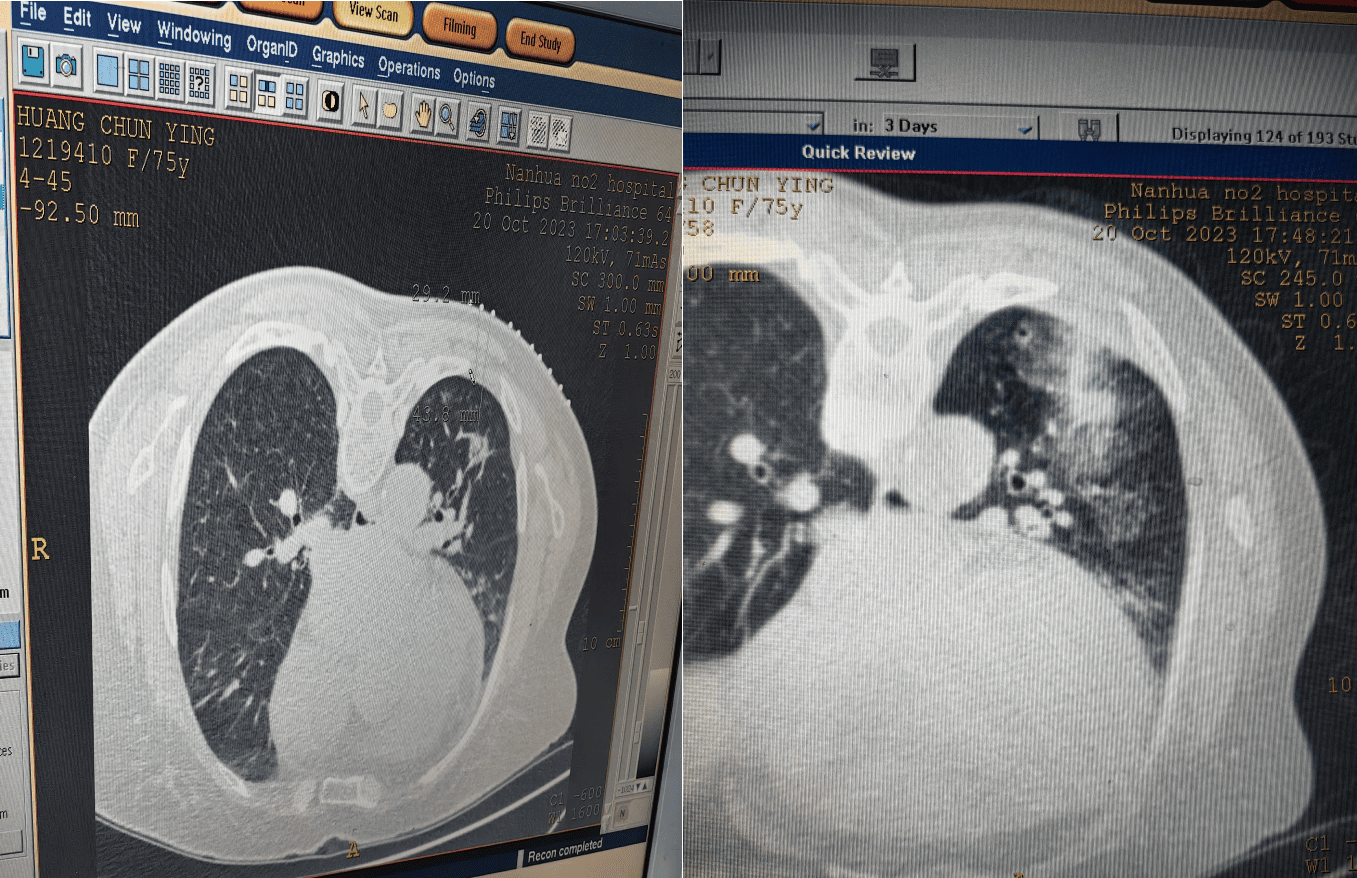 在介入中心医护团队密切配合,在呼吸与危重症医学科主任谭小武带领指导下,吴旭博士在手术助手的配合下沉稳娴熟地操控着穿刺针、调整消融参数等消融机器系统进行精准的穿刺定位、消融,不到20分钟即顺利完成消融术。黄女士全程未感疼痛、呼吸困难和其他不适。即刻复查胸部CT显示消融后呈现规整“圆中圆”晕完整包绕了结节,未见出血及气胸并发症。