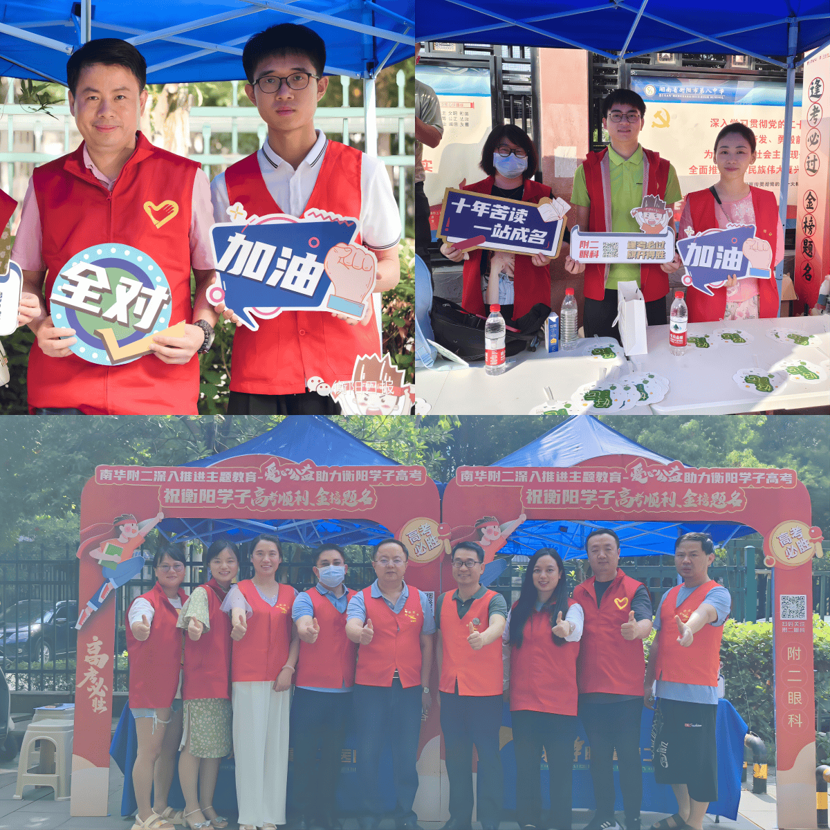 在今年高考期间,南华附二医院眼科硕士研究生作为志愿者在衡阳市一中、市八中设立爱心驿站,为高考学子和家长免费发放扇子、文具应急包、矿泉水、备用药品等物资以及科普考试期间用眼护眼知识。一份清凉、一个微笑、一句祝福,给考生及家长送去浓浓关怀,以实际行动助力衡阳学子高考,赢得了广大家长和市民的一致好评。