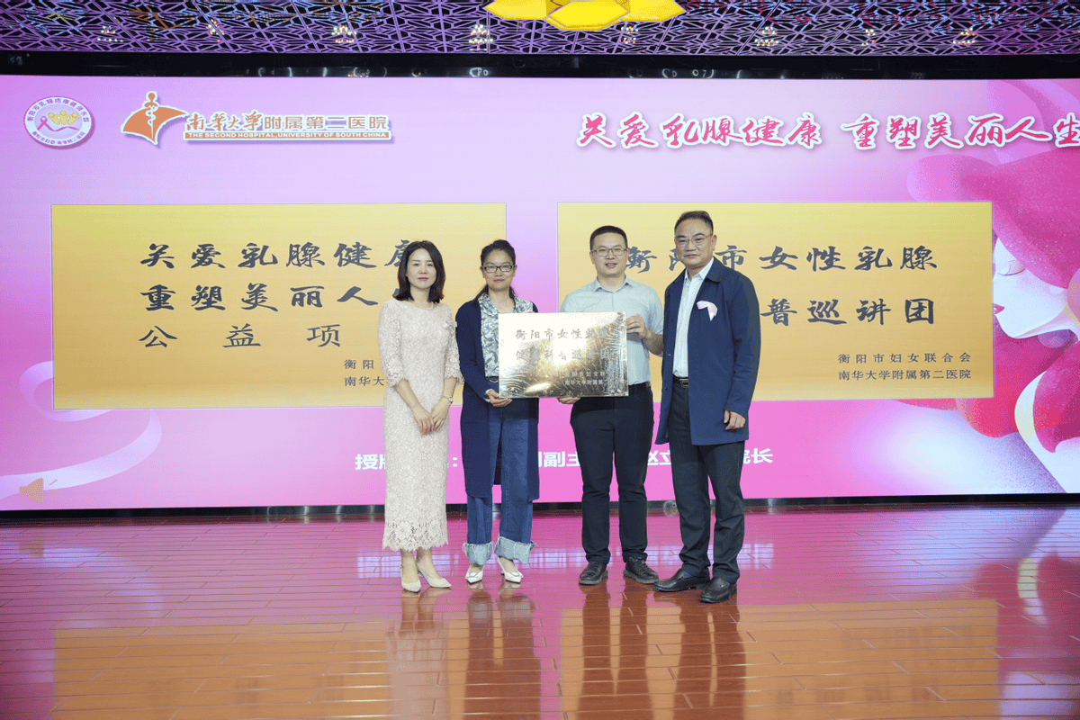 随后,在慷慨激昂的音乐声中,市妇联赵丹利副主席、南华大学附二医院赵立新副院长为“关爱乳腺健康、重塑美丽人生”公益项目揭牌,并给乳甲外科曹洪主任、周静护士长授牌“关爱乳腺健康、重塑美丽人生”及“衡阳市乳腺癌科普基地”。王兵副院长、正处级干部颜亚平教授给曹洪主任、周静护士长授牌“衡阳市女性乳腺健康数据检测中心”及“衡阳市乳腺癌康健俱乐部”。