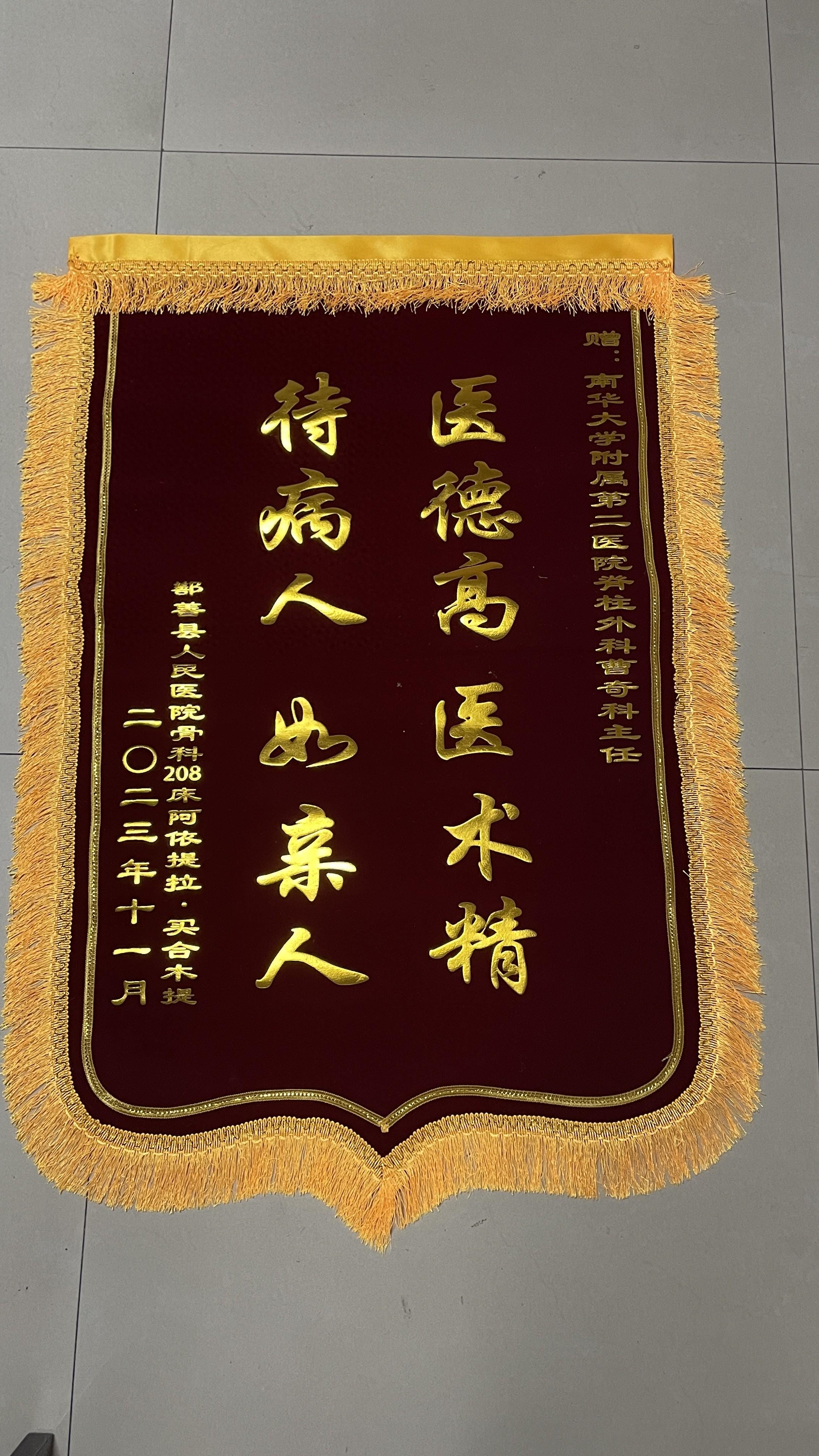 2023年12月8日,南华大学附属第二医院援疆医疗专家曹奇教授收到了来自鄯善县人民医院两位病人的锦旗,以此表达对他医术精湛和医德高尚的深切感谢。这份特别的礼物不仅是对曹教授个人的认可,也是对南华大学附属第二医院医疗服务的高度赞誉。