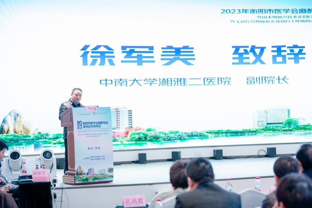 最后,中南大学湘雅二院徐军美副院长致辞,他首先赞扬了衡阳地区深厚的历史底蕴和卓越的人才培养传统,特别是衡阳医学院培养出的杰出人才,他们在全国范围内施展才华。接着,他对此次麻醉年会给予高度评价,他认为这不仅是一个聚集各路专家学者的重要学术平台,更是一个促进跨学科交流、推动医学创新的关键节点。他强调,通过这样的学术会议,可以激发更多创新思维的碰撞,促进新知识、新技术的产生,从而不断推动医学界的前行。他指出,这次年会的成功举办,不仅对医学专业人士有着深远的影响,更为广大人民群众的健康和福祉带来了实质性的益处。他期待着通过这样的交流和合作,能够使医疗诊疗技术得到更广泛的推广与应用,为更多患者提供更优质、更先进的医疗服务,真正实现科学发展与人民健康的共赢。