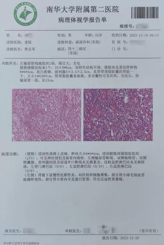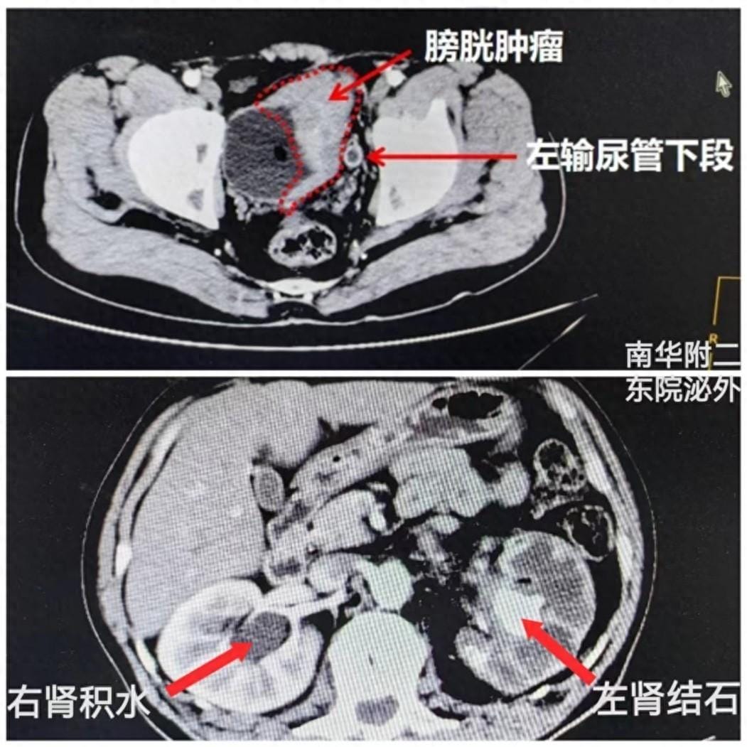CT提示膀胱左壁大量肿瘤并侵犯双输尿管下端;左肾铸型结石并积脓